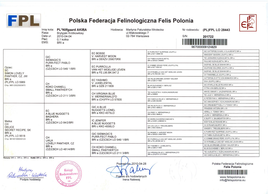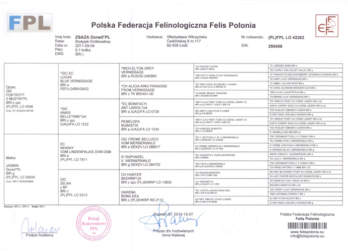 | Ojciec: | CH Zack Zuzu de la Horsky Park, SK (BRI a) | |